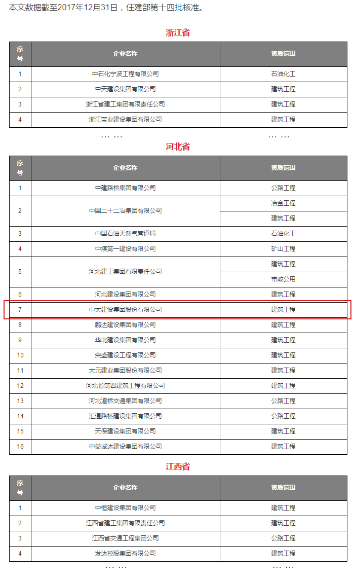 近日,由國家住房和城鄉建設部核準的2018年全國總承包特級企業名單公布,中太建設集團名列其中。